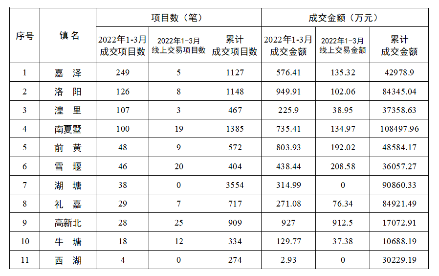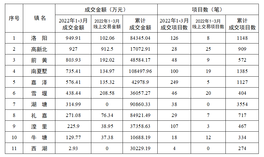 2022年一季度各镇(街道)农村产权交易情况表